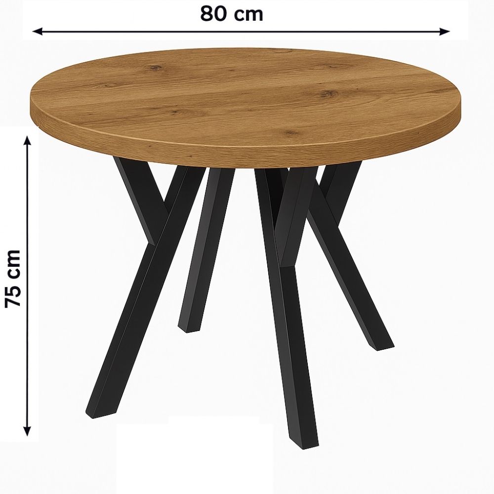 Stół okrągły o średnicy Ø 80cm wykonany jest z płyty laminowanej. Obrzeża wykończone oklejoną PCV. Blat pogrubiony i okejony okleiną o wysokości 36mm.